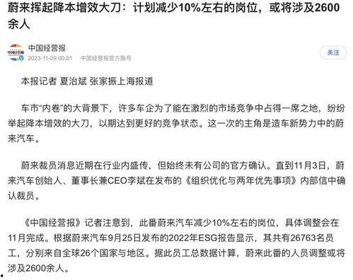 2. 资金压力:蔚来作为一家初创企业,资金压力一直较大。在市场竞争加剧的情况下,资金链的紧张可能迫使蔚来不得不进行裁员。